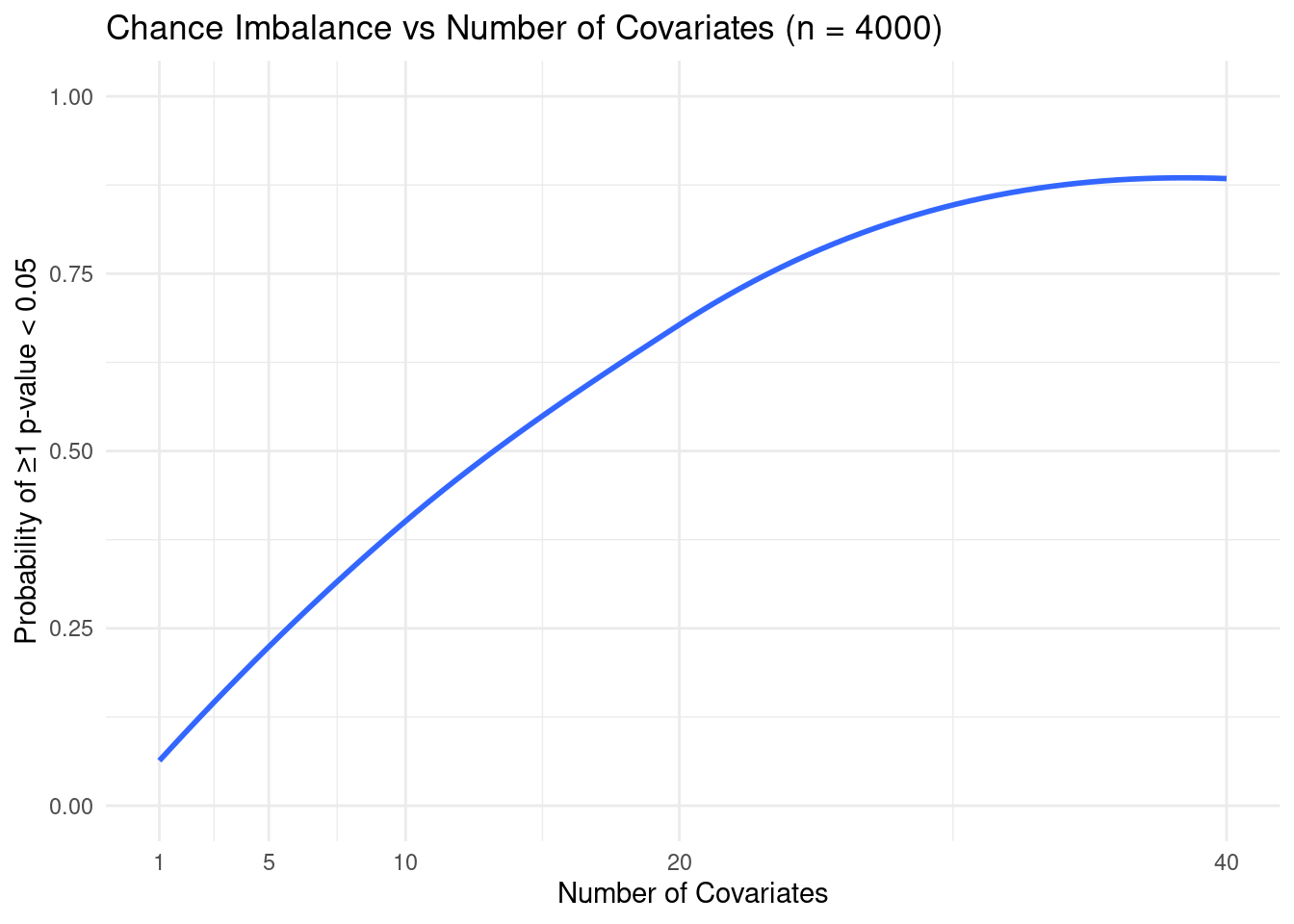 결과에서 알 수 있듯이, 사람의 수가 4000명이라고 가정하였을 때 보고 싶은 공변량의 갯수가 20개 이상만 되어도 하나 이상의 특성이 두 집단에서 차이가 날 확률이 50프로가 넘게 됩니다. 따라서 RCT에서도 공변량이 많은 경우 두 그룹의 모든 특성이 항상 완전히 일치한다고 말하기는 힘듭니다.