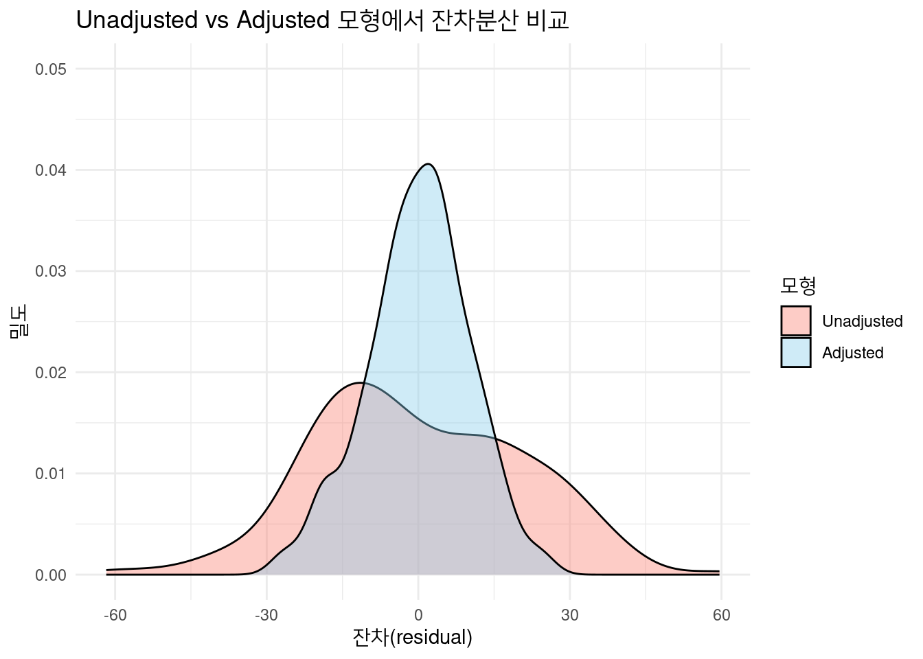 library(ggplot2)library(reshape2)set.seed(123)n<-200baseline<-rnorm(n, mean =150, sd =20)treat<-rbinom(n, 1, 0.5)y<-baseline-20*treat+rnorm(n, sd =10)df<-data.frame(y, treat =factor(treat), baseline)# Unadjusted 모형m0<-lm(y~treat, data =df)df$res0<-resid(m0)# Adjusted 모형(baseline을 포함)m1<-lm(y~treat+baseline, data =df)df$res1<-resid(m1)df_long<-melt(df, measure.vars =c("res0","res1"), variable.name ="model", value.name ="residual")ggplot(df_long, aes(x =residual, fill =model))+geom_density(alpha =0.4)+coord_cartesian(ylim =c(0, 0.05))+labs( title ="Unadjusted vs Adjusted 모형에서 잔차분산 비교", x ="잔차(residual)", y ="밀도")+scale_fill_manual( name ="모형", values =c("res0"="salmon", "res1"="skyblue"), labels =c("Unadjusted", "Adjusted"))+theme_minimal()