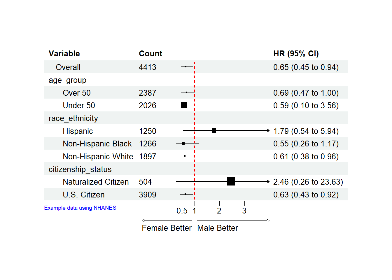 df<- TableSubgroupMultiCox(Surv(PERMTH_EXM, MORTSTAT) ~ gender, var_subgroups = c("age_group", "race_ethnicity", "citizenship_status"), data = merged_data_mod, line = FALSE)